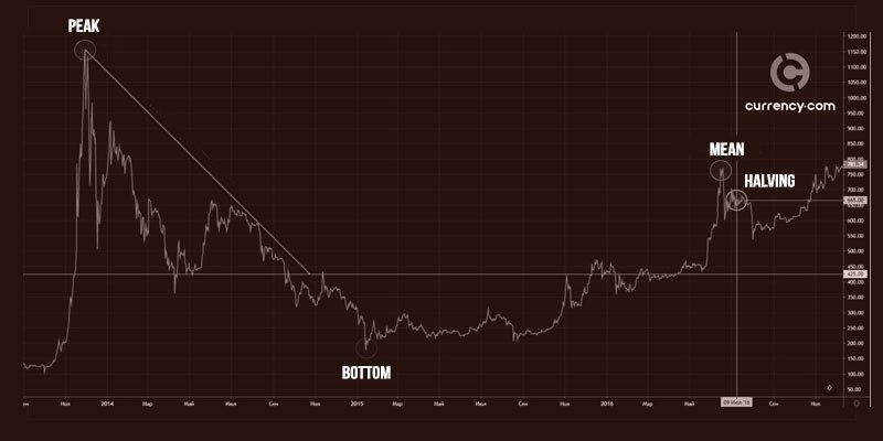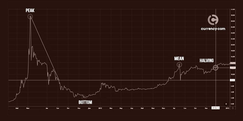 Bitcoin reached its first peak at $ 32 in June 2011, followed immediately by a collapse. The fall occurred within the framework of the technical analysis model "Descending Triangle". Price highs were constantly decreasing, and the support line was the level of $ 8. After the breakdown of the support level, the price rushed to the bottom, which became the mark of $ 2. This was followed by the recovery process to the average value from the previous peak - this is $ 15. Before halving, the price moved in different directions, but on the day of halving, November 28, 2012, it was $ 12.25, which is close to the average value from the previous peak. 13 months after halving the award, Bitcoin reached a new peak.