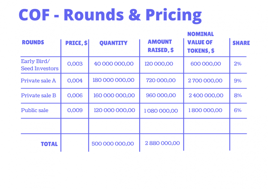During the presale campaign (Private Sale A round), the Cryptoffer token (COF) is available to buy for $0.004. In total, we will offer 180 000 000 COF tokens. The target for the Private Sale A round is to raise $720 000.